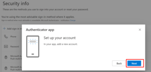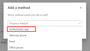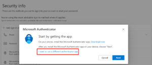 11. Ao carregar em Authenticator app irá abrir uma janela do Microsoft Authenticator, clique em ‘I want to use a different authenticator app‘: