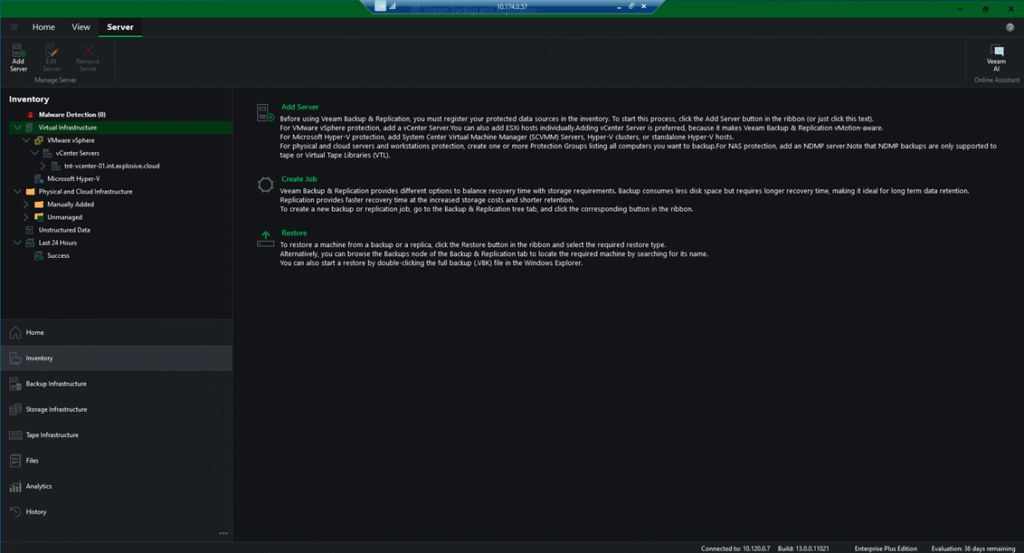Outra mudança visível está nas interfaces de gestão. O Veeam v13 traz uma nova interface web (Web UI), que embora ainda esteja em versão beta, já permite executar algumas tarefas do dia a dia de forma simples e intuitiva, através de um browser. Esta abordagem facilita muito o acesso e a gestão remota do ambiente de backup, especialmente em equipas com vários utilizadores.
