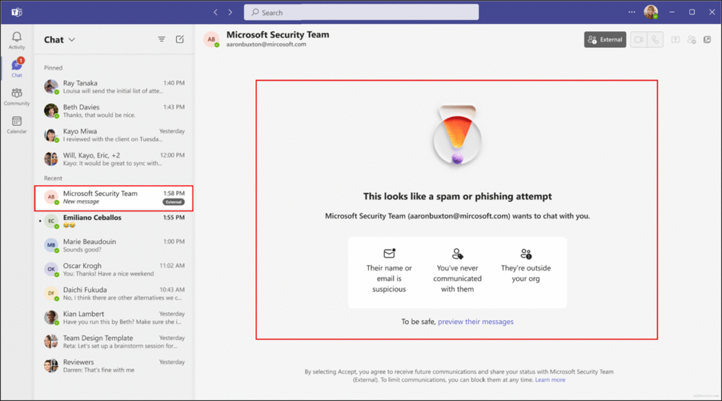 O Teams passou a identificar tentativas de personificação de marca ou identidade quando um utilizador externo contacta alguém pela primeira vez. A funcionalidade alerta os utilizadores sobre possíveis riscos, promovendo maior consciência e reduzindo a probabilidade de interacção com atacantes.